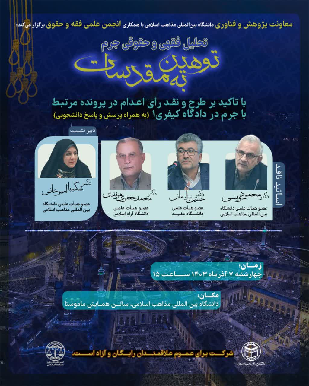 نشست علمی 《تحلیل فقهی و حقوقی جرم توهین به مقدسات》 با تاکید بر طرح و نقد رای اعدام در پرونده مرتبط با جرم در دادگاه کیفری ۱ همراه با پرسش و پاسخ دانشجویی با حضور اساتید ناقد: جناب آقای دکتر محمود ویسی عضو هیئت علمی دانشگاه بین المللی مذاهب اسلامی، جناب آقای دکتر حسین سلیمانی عضو هیئت علمی دانشگاه مفید، جناب آقای دکتر محمد جعفری هرندی عضو هیئت علمی دانشگاه آزاد اسلامی، دبیر نشست: سرکار خانم دکتر شکیبا امیرخانی عضو هیئت علمی دانشگاه بین المللی مذاهب اسلامی روز چهارشنبه ۷ آذر ماه در سالن همایش های شهید ماموستا شیخ الاسلام دانشگاه بین المللی مذاهب اسلامی با همکاری معاونت پژوهش و فناوری و انجمن علمی فقه و حقوق دانشگاه برگزار شد.