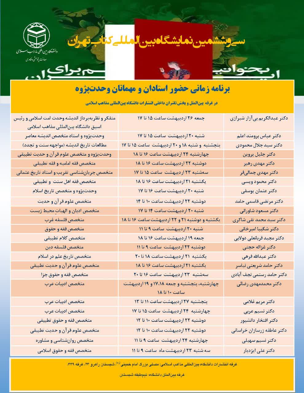 برنامه زمانی حضور اساتید و مهمانان وحدت پژوه در غرفه بینالملل و پخش ناشران داخلی انتشارات دانشگاه بینالمللی مذاهب اسلامی