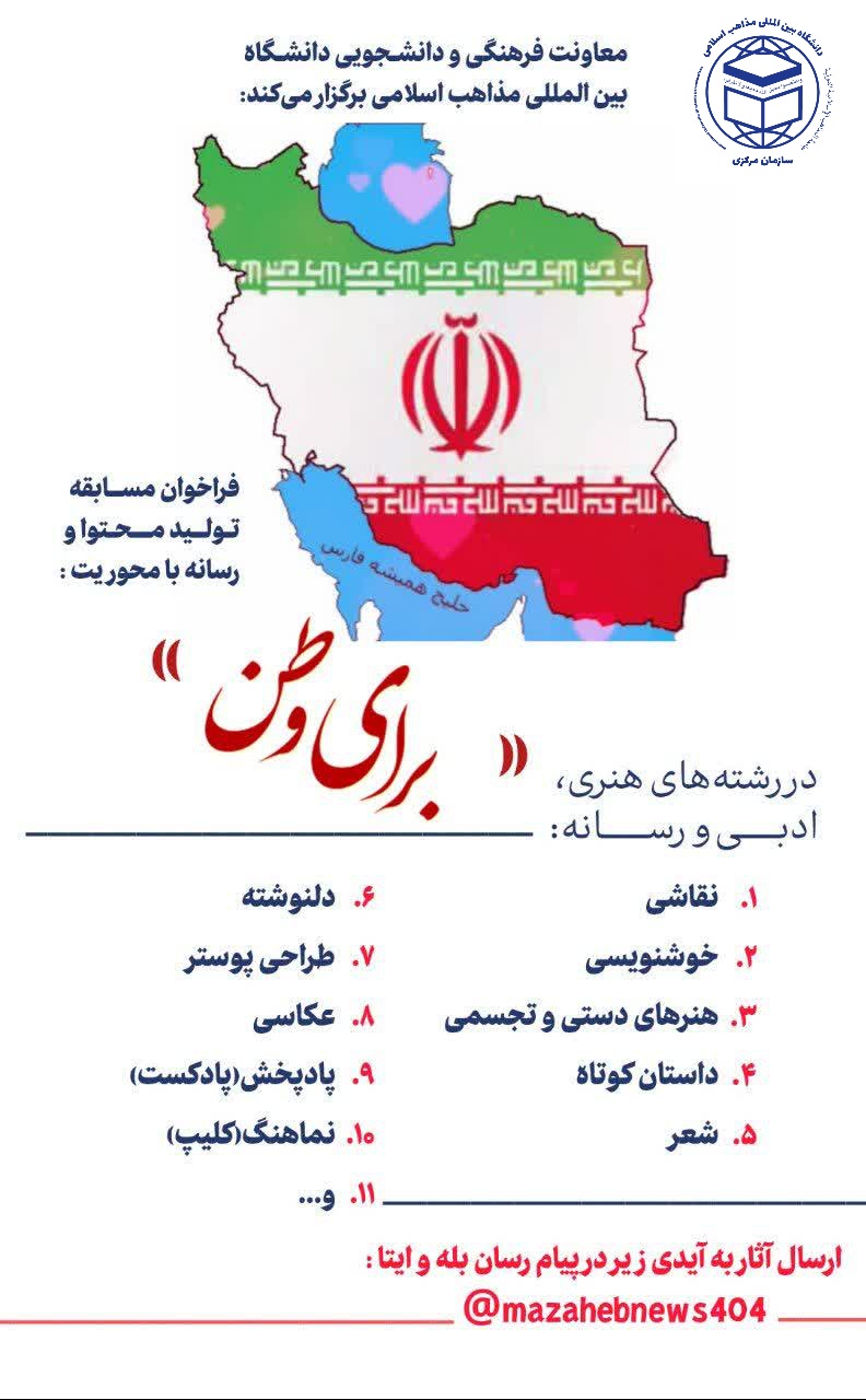 مهلت ارسال آثار به فراخوان مسابقه تولید محتوا و رسانه با محوریت برای وطن دانشگاه بین المللی مذاهب اسلامی تا ۱۵ تیرماه