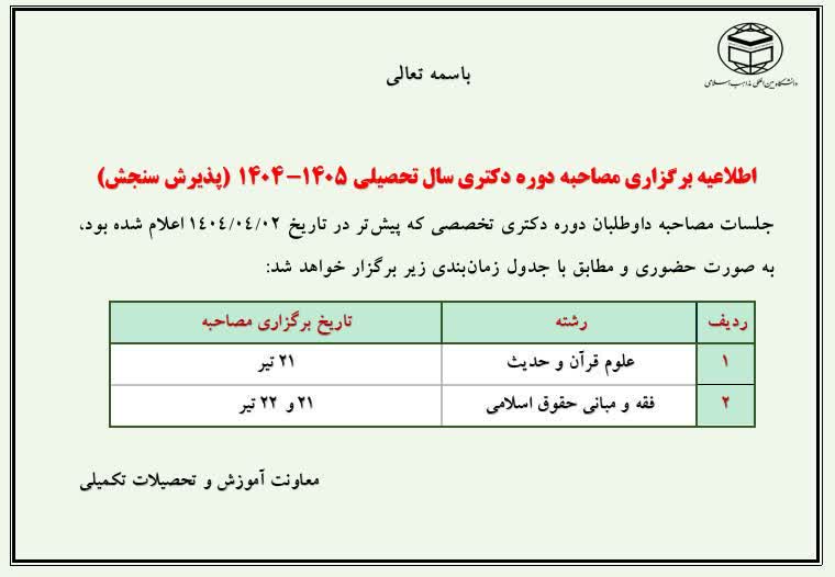 اطلاعیه برگزاری مصاحبه دوره دکتری پذیرش سنجش در رشتههای علوم قرآن و فقه و حقوق ۰۷ تیر ۱۴۰۴ | ۰۰:۲۱ کد : ۵۵۲ اطلاعیه ها تازه ترین اخبار تهران و شعب ارسال به دیگران نام شما ایمیل شما ایمیل دریافتکننده ارسال انصراف تعداد بازدید:۱۳۰۵