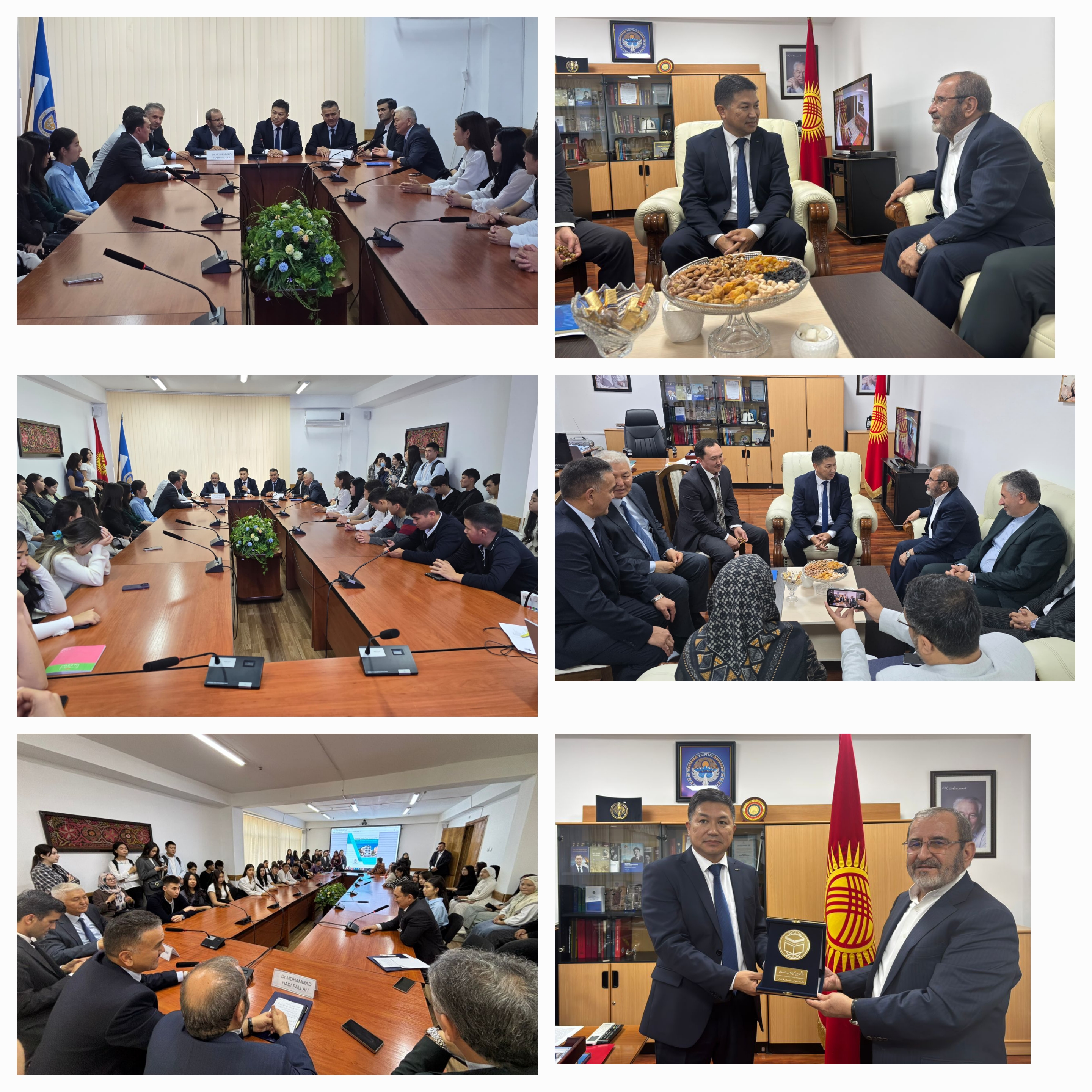 رییس دانشگاه بین‌المللی مذاهب اسلامی با حضور در دانشکده شرق شناسی و روابط بین الملل دانشگاه دولتی بیشکک که آقای تالاس بک مشرپ اف؛ رئیس دانشکده، آقای قاناتبیک توقتوبایف معاون دانشگاه و همچنین آقای میرلان دیلدائف رئیس دانشگاه و هیات ایرانی حضور داشتند با دانشجویان این دانشکده دیدار و گفت‌وگو نمود.