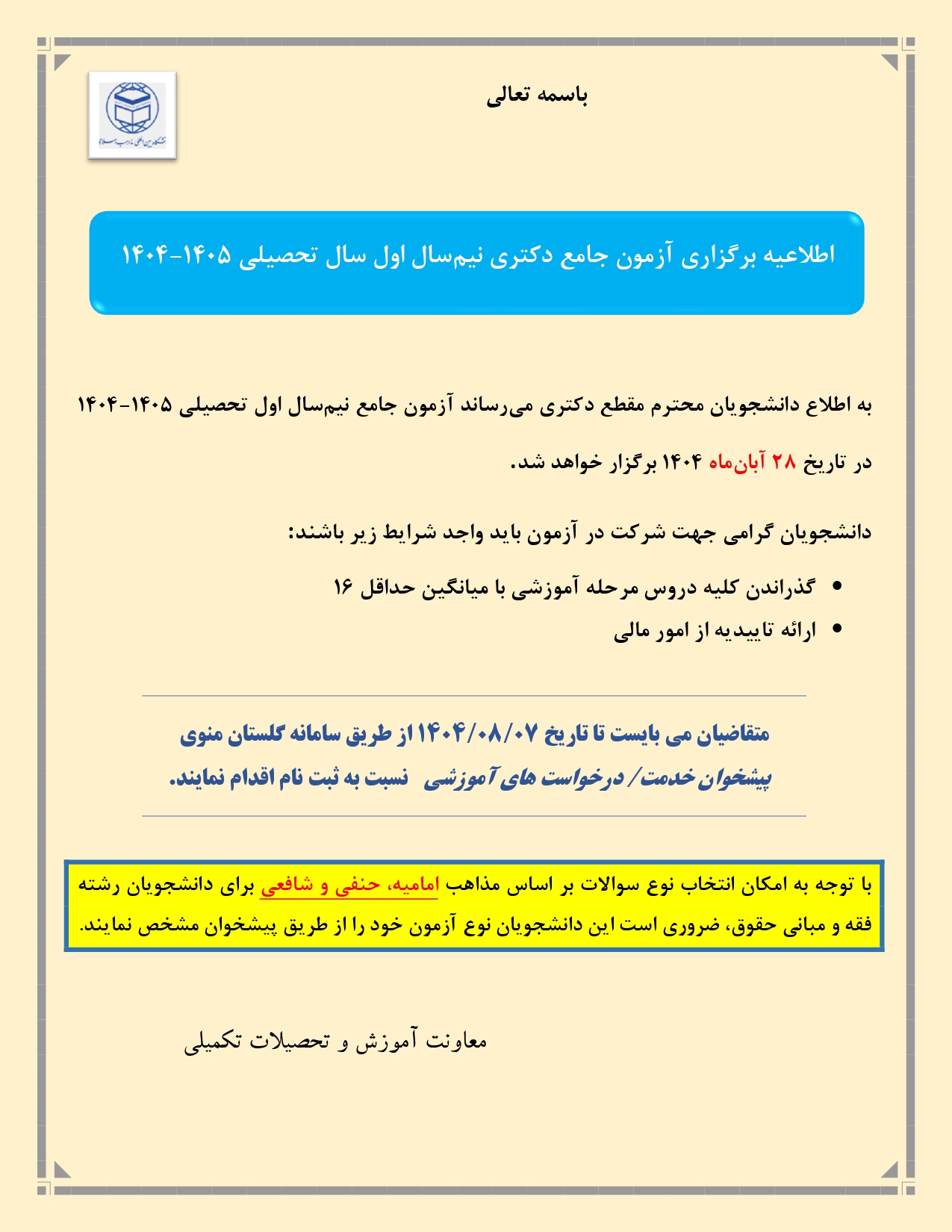 اطلاعیه ثبت نام آزمون جامع دکتری نیمسال اول ۱۴۰۵-۱۴۰۴
